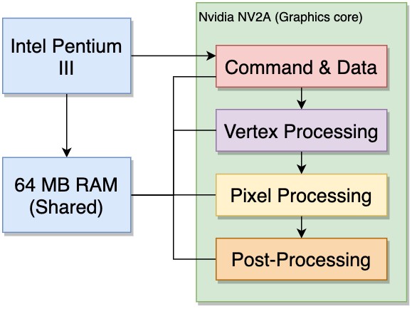 Veuillez noter que, bien que le pipeline du GPU de la Xbox soit basé sur l'architecture NV20, le NV2A a quelques modifications qui ne sont pas compatibles avec le reste de la série NV20 (plus important encore, il a été adapté pour fonctionner dans un environnement UMA).