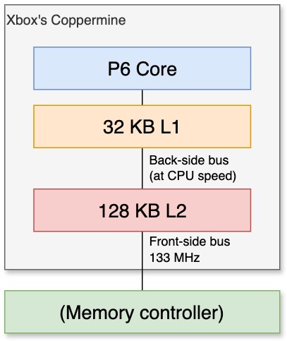 - Cache L2 intégré de 128 KiB : C'est étrange puisque le Coppermine de série a 256 KiB de L2 [3]. En fait, le Coppermine128 (que l'on trouve dans la marque 'Celeron' d'Intel, l'alternative bas de gamme de Pentium) a la même quantité de L2 [4]. Par conséquent, cela a probablement été fait pour réduire les coûts de fabrication et maintenir cette console à un prix compétitif.