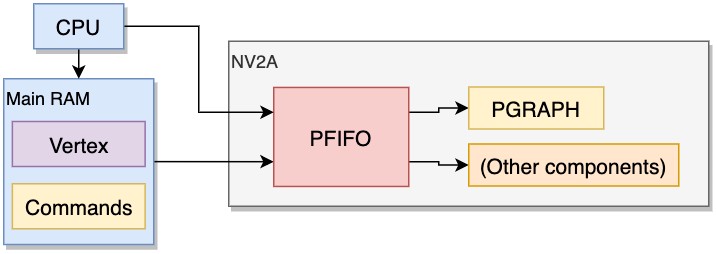 Premièrement et avant tout, il faut expliquer comment le GPU peut recevoir des commandes du CPU. Pour cela, le GPU contient un processeur de commandes appelé PFIFO qui récupère et traite efficacement les commandes graphiques (appelées Pushbuffer) de manière FIFO, les commandes déballées sont ensuite livrées au PGRAPH (le bloc en charge du traitement graphique) et à d'autres moteurs.
