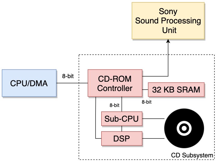 - Um controlador de CD: este é o intermediário entre o subsistema de CD e o resto do console, recebendo comandos da CPU principal (organizados em fila) e disparando interrupções após certos eventos. Como controlador, o chip conversa com a Sub-CPU e recebe, do DSP, os dados do CD. Além disso, o controlador contém uma unidade DMA e está conectada ao SPU, o que permite que ele transmita áudio diretamente.