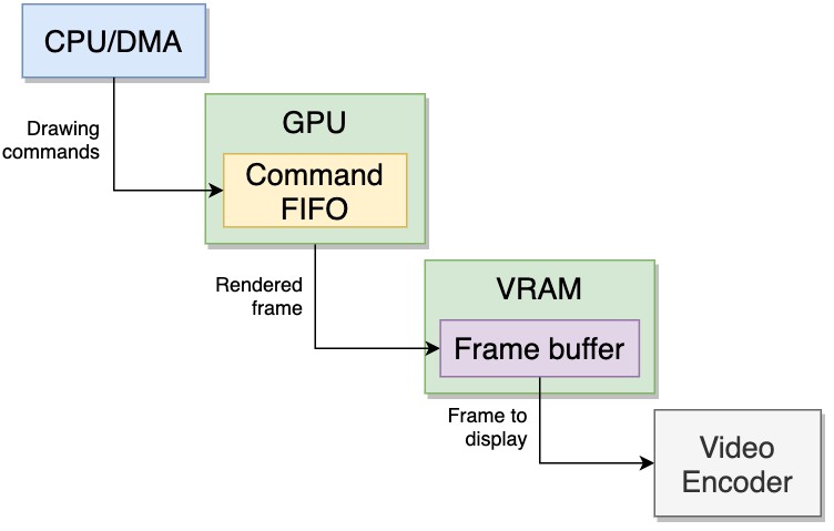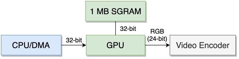 O sistema possui 1 MB de VRAM que é usada para armazenar o buffer de imagem (do inglês, frame buffer), texturas e outros recursos que a GPU precisa para renderizar uma cena. A CPU pode preencher essa área usando o DMA.