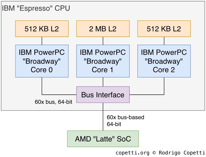 Back to the Wii U, IBM grabbed the 60x bus again to interconnect the three cores in Espresso. Additionally, they implemented a variant of the bus to connect Espresso (as a chip) with the rest of the motherboard.