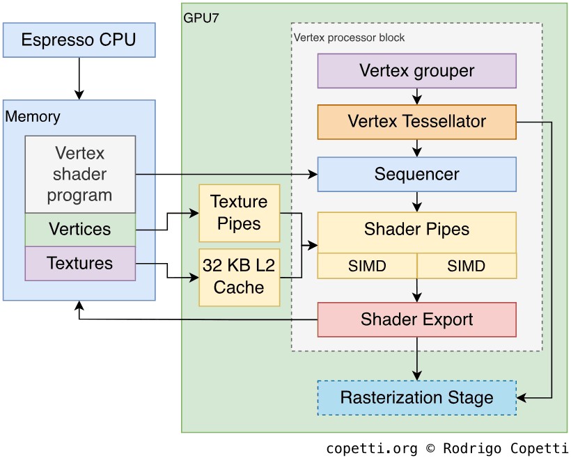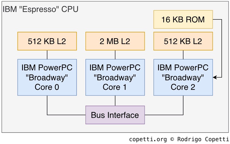 Before we start the real analysis, let me go back to the previous diagram. As you've seen there, Espresso is a symmetric multi-core system, just like Xenon. But that's not all, as each of Espresso's cores appears to be a replica of IBM's Broadway, the exact same core used with the Wii (which in turn, is a tweaked version of Gekko, found in the GameCube).