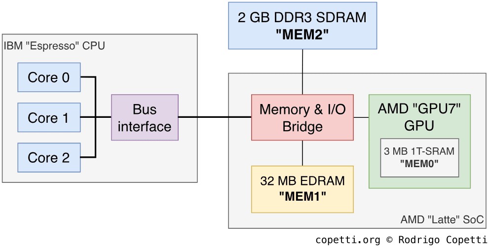 In some ways, this system follows the Unified Memory architecture (UMA). Though, with MEM1 and MEM2 in the middle, I wouldn't say this system is fully compliant with the UMA model (unlike some of its competitors).