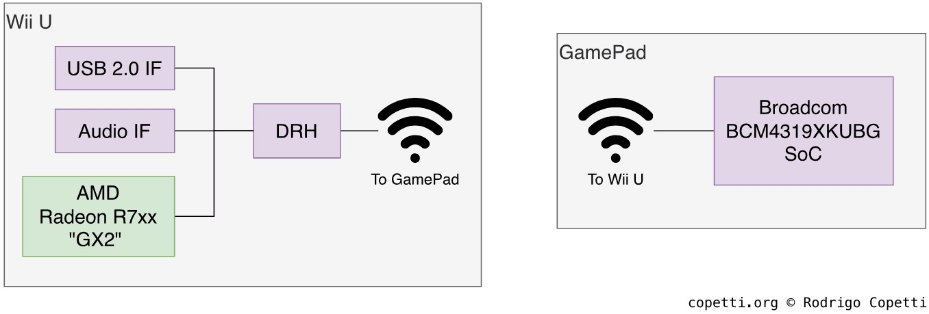 In summary, the Wii U and the GamePad communicate with each other using 802.11n in the 5 GHz band. The console acts as an access point (AP) and the GamePad acts as its single client. Be as it may, Memahaxx also reported that the console's operating system implemented the possibility of using two GamePads at once, albeit left unused.