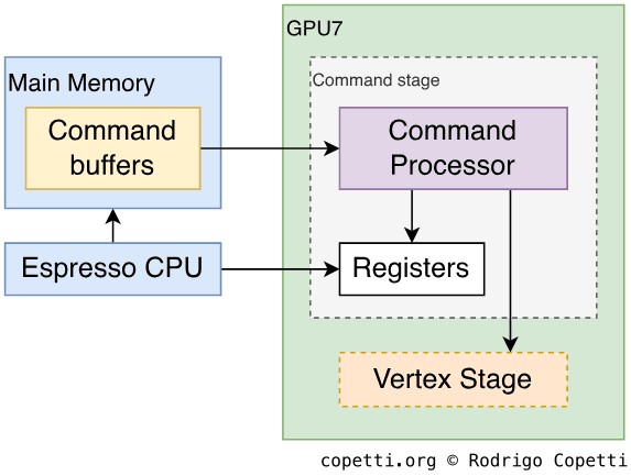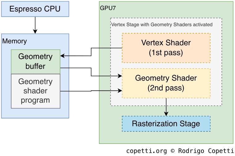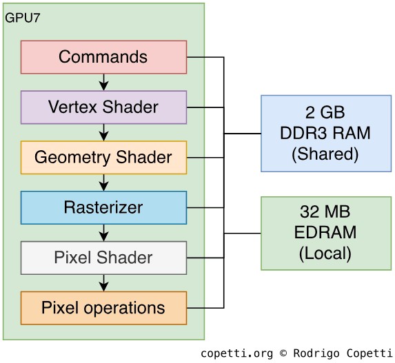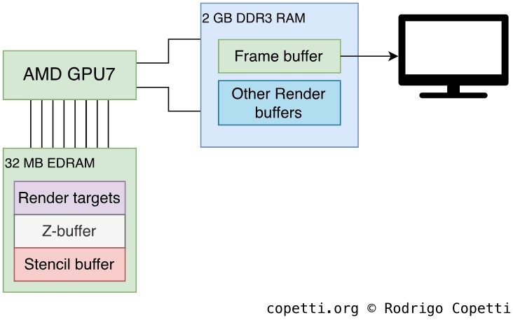 In any case, from the developer's point of view, only MEM2 and MEM1 (the two bigger blocks) are accessible. The 2 GB of DDR3 may hold any kind of data (supplying both CPU and GPU), while the other two have more limited functions. MEM1 is used for graphics data (more details in the 'Graphics' section) and MEM0 is used by the operating system (more details in the 'Operating System' section).