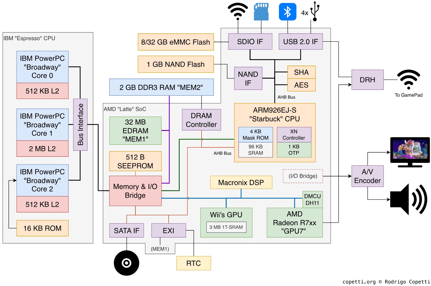 At this point, it's fair to say that neither Nintendo nor IBM have publicly documented the inner workings of Espresso (unlike Xenon and Cell from which many IBM engineers published papers on IBM's now-defunct developerWorks portal). I guess that neither planned to commercialise Espresso outside the Wii U. As a consequence, this section has been possible due to the countless hours spent by hacking groups like fail0verflow (a.k.a Team Twiizers) which not only managed to reverse-engineer this system, but also take the time to publish documentation about it (don't forget to look at the cited documents if you enjoy the topic). For this study, I've combined third-party research with public information from IBM (related to Broadway) and Freescale, and the result is what you see below.