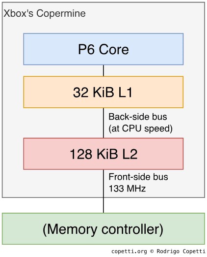 英特尔推出了大量采用P6微架构的芯片。 Xbox包括一个名为铜矿(Coppermine)的型号。 它被称为奔腾III的第二次修订版(取代了"Katmai"内核),具有以下组件: