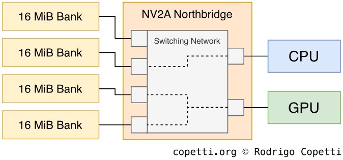 我们已经看到,这种设计有时会很麻烦。 不过,程序可以通过将数据分散到不同的内存库来解决这个问题。 NV2A实现了一个交换网络,可以让不同的单元(CPU、GPU等)同时访问它们[9] [10]。