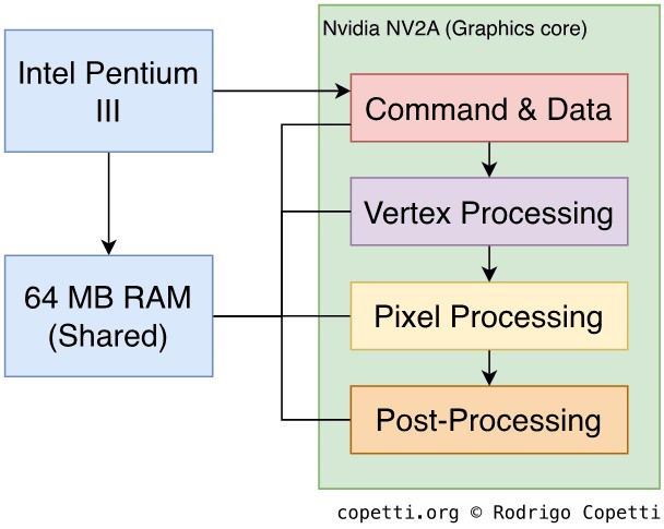 说完这些,让我们来看看Xbox是如何绘制帧的。 其中一些解释与GameCube的Flipper非常相似,因此如果您在阅读这篇文章时遇到困难,也可以阅读一下这篇文章。