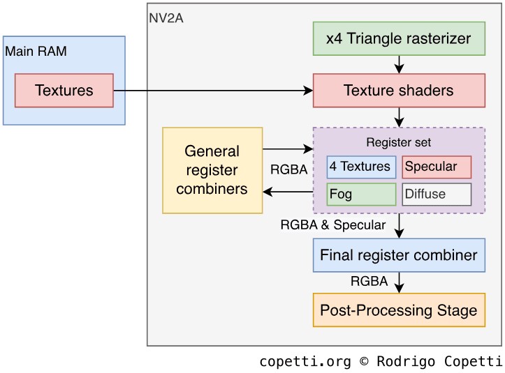 请注意,虽然Xbox的GPU流水线基于NV20架构,但NV2A有一些与NV20系列其他产品不兼容的修改(最重要的是,它已被调整为在统一内存架构环境中工作)。