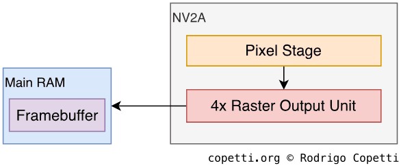 在这一阶段,顶点被转换成像素。 这一过程由光栅化器开始,光栅化器生成像素来绘制每个三角形。 NV2A的光栅化器每个周期可生成四个像素。之后,4个纹理着色器用于从内存中获取纹理[15],这些着色器还能自动应用各向异性过滤、mipmapping 和阴影缓冲(shadow buffering)。 阴影缓冲用于测试像素是可见还是被光源遮挡,从而应用正确的颜色。 此时,GPU还可以执行剪切和早期Z测试(NV2A将Z缓冲压缩为原来的四倍,以节省带宽,从而大大提高了性能)。