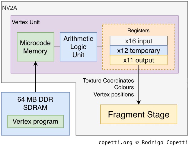 对于GPU而言,这是一个特别有趣的部分。 在这一阶段,GPU能够对我们的几何体进行顶点变换。 我们已经在Flipper上看到过这一功能,但与Flipper不同的是,这款GPU使用的是可编程引擎。 这意味着开发人员可以指定执行哪些顶点操作以及如何执行,而不是依赖于预定义的程序。 不过,如果需要,NV2A也可以在"固定"模式下运行。