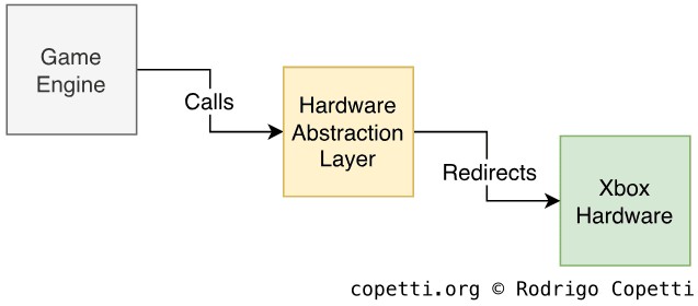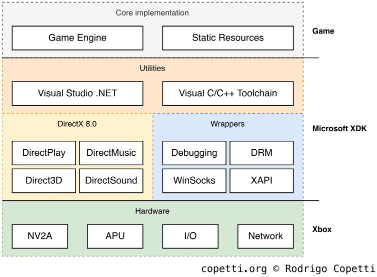 内核借用了Windows 2000内核[23]的大量代码库(而Windows 2000内核又基于现代的Windows NT架构)。 结果是一个经过精简的Windows 2000内核,只嵌入了Xbox硬件所需的组件。 最后,这些组件被压缩打包成一个单一的可执行文件[24],以优化内存效率。 总之,你可以把它看作是一台高度优化的Windows机器,专为游戏而设计。