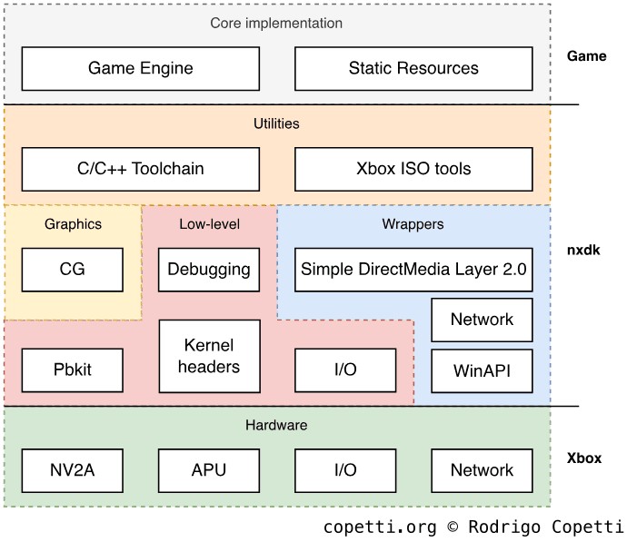 NXDK的结构。 请注意,尽管一些低级库被高级库所包裹,但开发者仍可访问它们